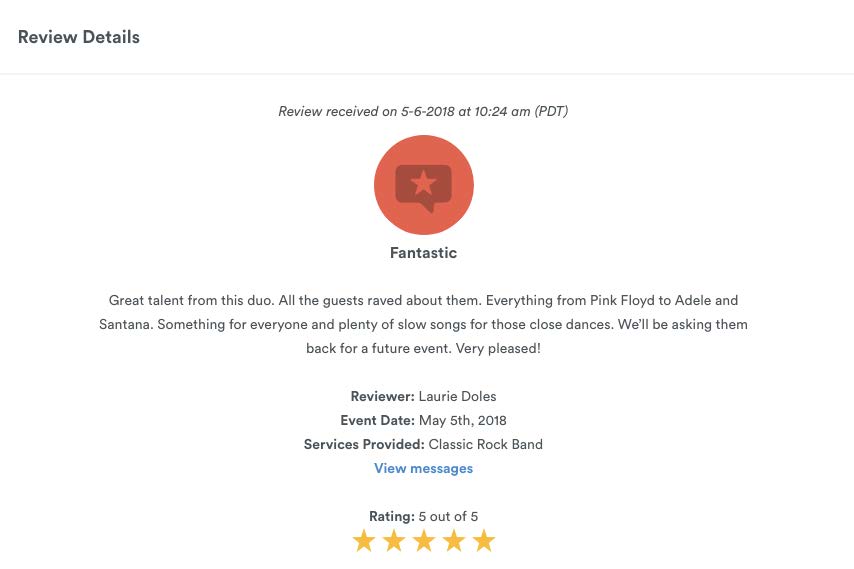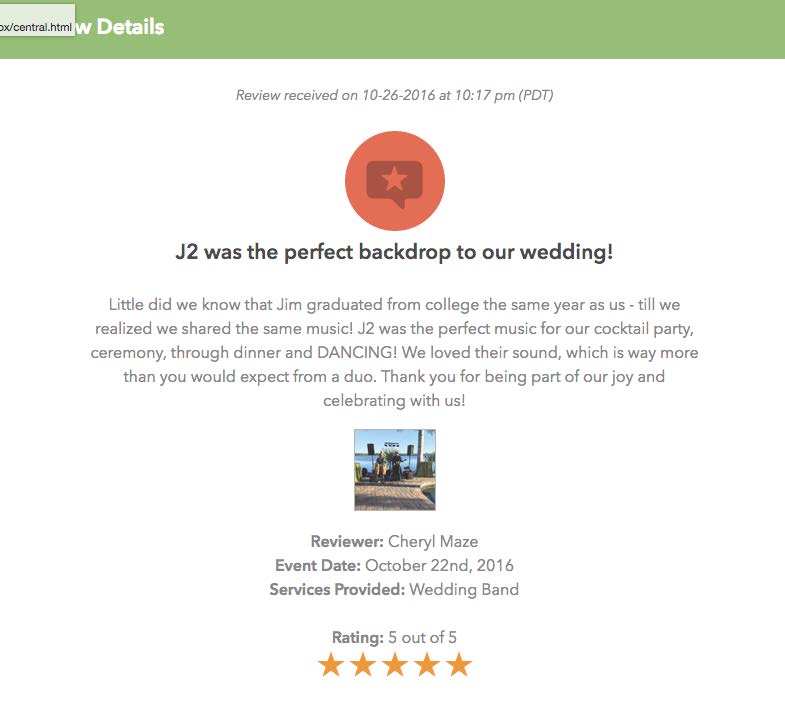 Five-star review from wedding party in Groveland WOW! They pack a punch!!! After looking for EVER for the “perfect” band for wedding we luckily found J2! I knew they were the band for us after hearing only a few seconds of their song gallery. We have a varied and eclectic group of friends and family and EVERY SINGLE ONE in attendance (100) raved about the quality of sound, impressive repertoire, and talent that these two bring. EVERYONE danced,ages 19 to 80, and loved the music and personality of J2! Both are so eager for everyone to have a great time that it oozes out of every note they play! I wondered how such big sound could come out of only two artists. The secret is that they record themselves playing other instruments and use that in their sets. So you really do get a FULL band at a duo price. :-)Pure brilliance. These two are our new favorite band and we will use them for our Quest Air Hanggliding events when we need live music. We have people from all over the world, of all ages, who fly with us. I have no doubt J2 will please the entire crowd.