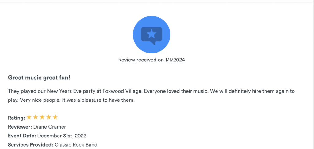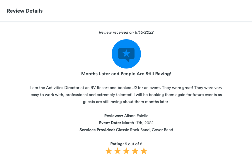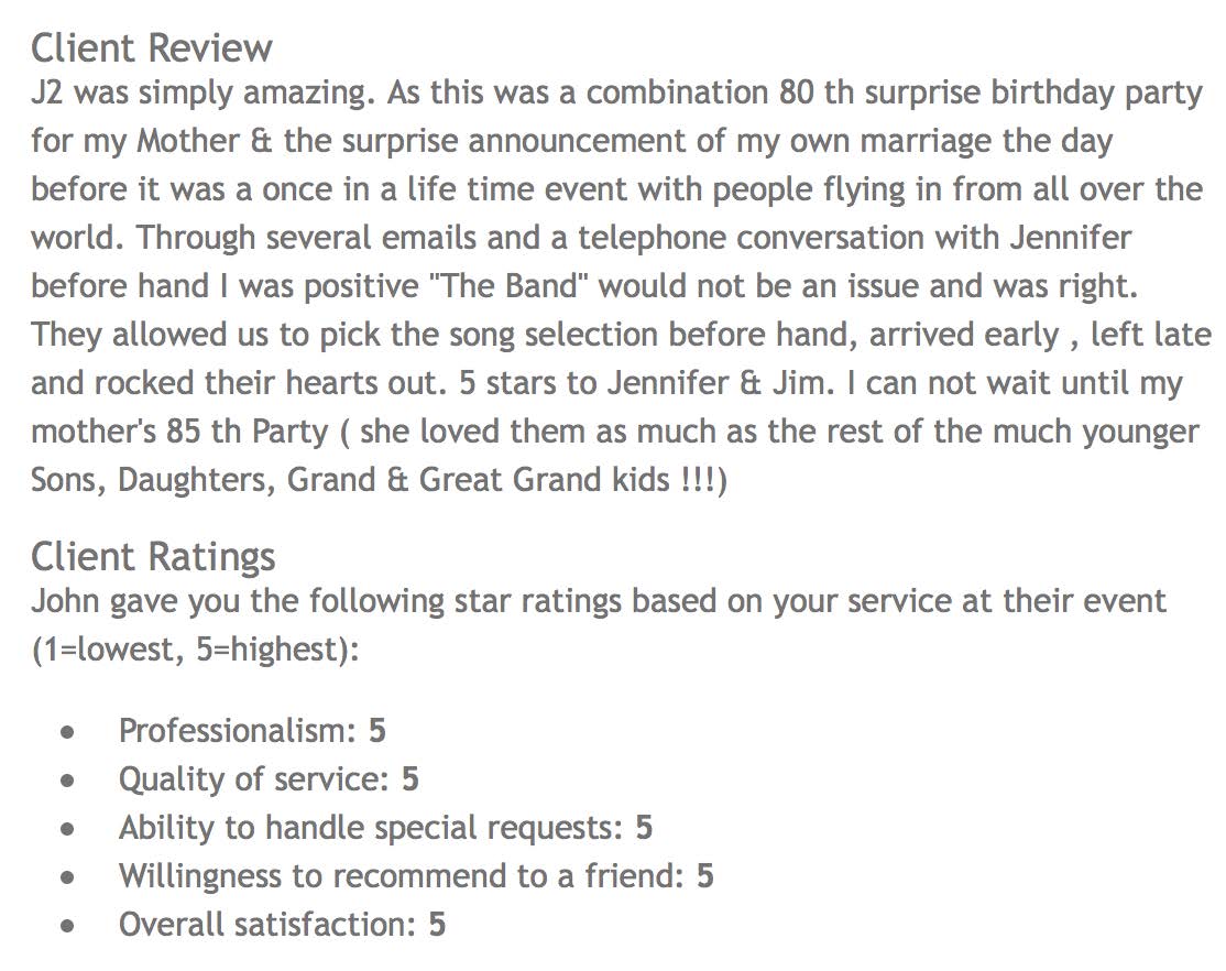 Five-star review from West Bay Homes in Lithia, FL. J2 “Rocked” our Holiday Party. Literally! So much so that we asked for more! J2 delivered with an encore set equal to the previous 3-hour set. They were awesome. J2 is great to work with. Jim took the time to scout our venue, gave great suggestions for set-up, allowed ample preparation time – all of which was very important to us. They followed through with everything and the final performance was outstanding!
